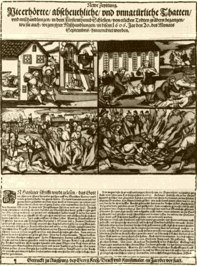 W roku 1606 w mieście Frankenstein (obecnie Ząbkowice Śląskie) na Dolnym Śląsku panowała zaraza. W jej wyniku zmarło łącznie 2061 osób, w tym 1503 osoby dorosłe i 558 dzieci, czyli ponad 1/3 mieszkańców ówczesnego miasta! O ściągnięcie pomoru przesądna ludność oskarżyła miejscowych grabarzy, co powołani przez radę miejską sędziowie początkowo uznali za zabobon. Zdanie zmienili jednak po przeszukaniu domu jednego z oskarżonych. Znaleziono tam tajemnicze pojemniki z proszkiem nieznanego pochodzenia.