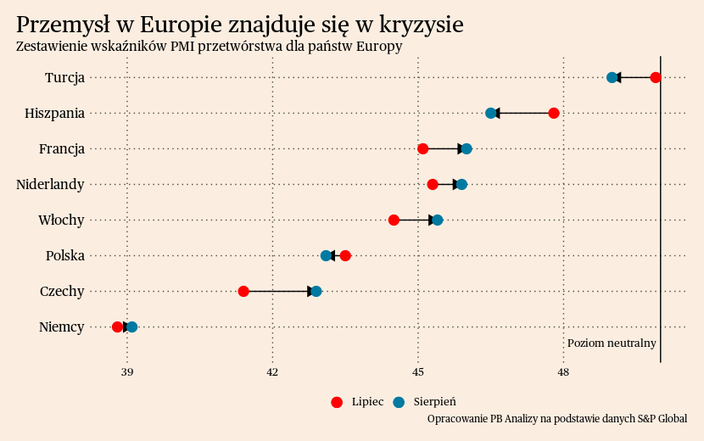 W większości badanych krajów Europy wskaźnik PMI dla przetwórstwa poprawił się w sierpniu, ale pozostał wyraźnie poniżej neutralnego poziomu 50 pkt. Jedynym wyjątkiem jest Turcja, która z odczytem 49 pkt. znajduje się najbliżej neutralnego poziomu. Wskaźnik znacząco wzrósł w Czechach, jednak koniunktura wciąż osiąga tam drugi najgorszy rezultat z badanych krajów.
