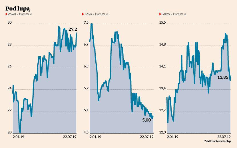 Jak podkreślają autorzy raportów, dwie z trzech spółek regularnie płacą dywidendę. Do kieszeni akcjonariuszy Voxela trafi we wrześniu 0,99 zł na akcję, w Ferro będzie to 1,12 zł (w dwóch ratach — pod koniec lipca 0,50 zł, reszta pod koniec października). W Toyi dywidendy za 2018 r. nie uchwalono — zysk zasilił kapitał zapasowy.