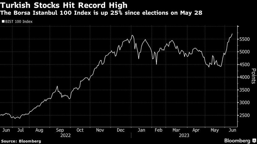 W poniedziałek główny indeks parkietu w Stambule, BIST 100 wzrósł o 1,8 proc. ustanawiając nowy historyczny szczyt. Tym samym od czasu drugiej tury wyborów prezydenckich z 28 maja, w której reelekcję zapewnił sobie Recep Erdogan wskaźnik zyskał aż 25 proc. Choć wynik jest spektakularny, turecka giełda jest w tym roku nadal jedną z najsłabszych spośród głównych pakietów na świecie.