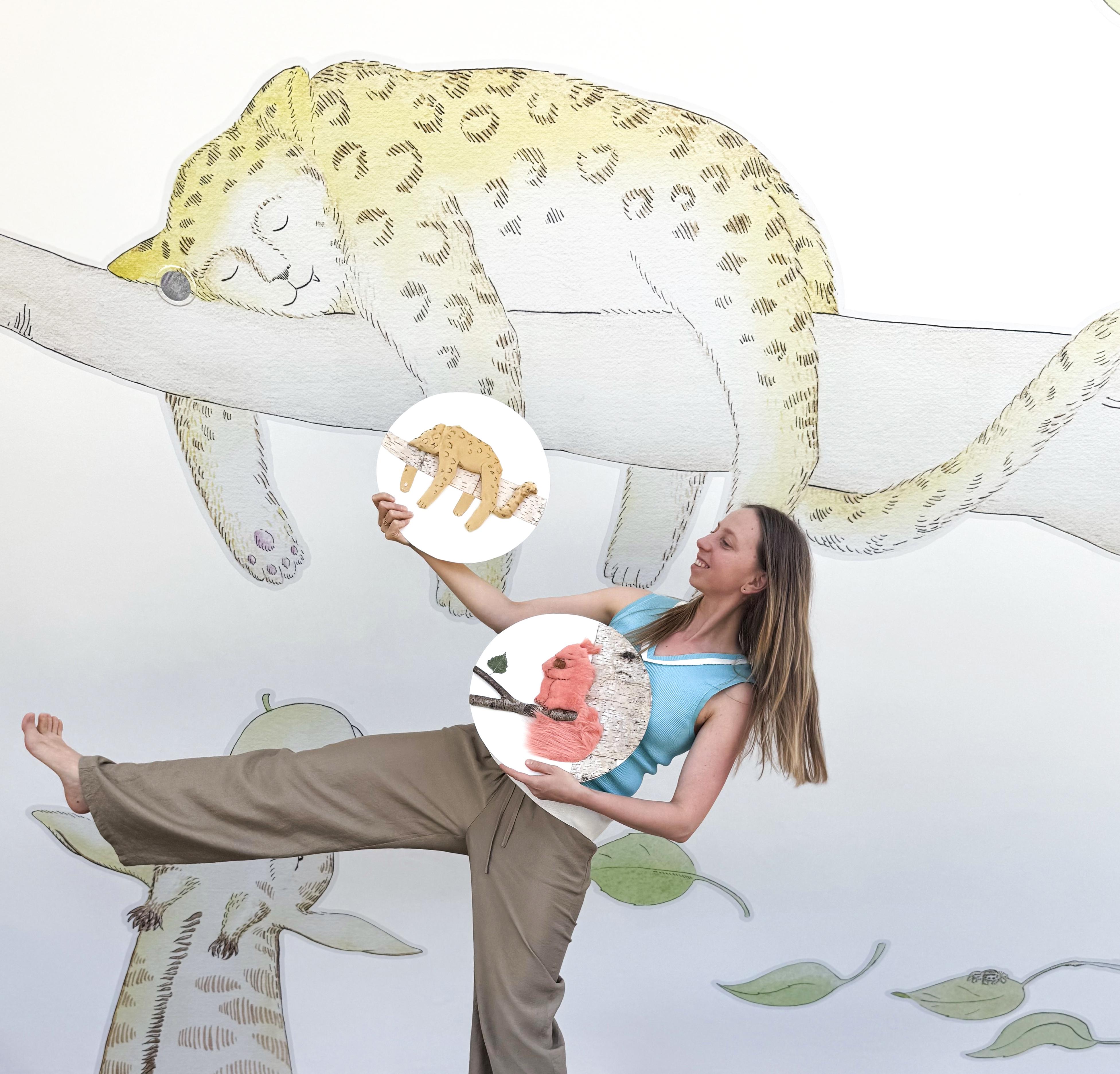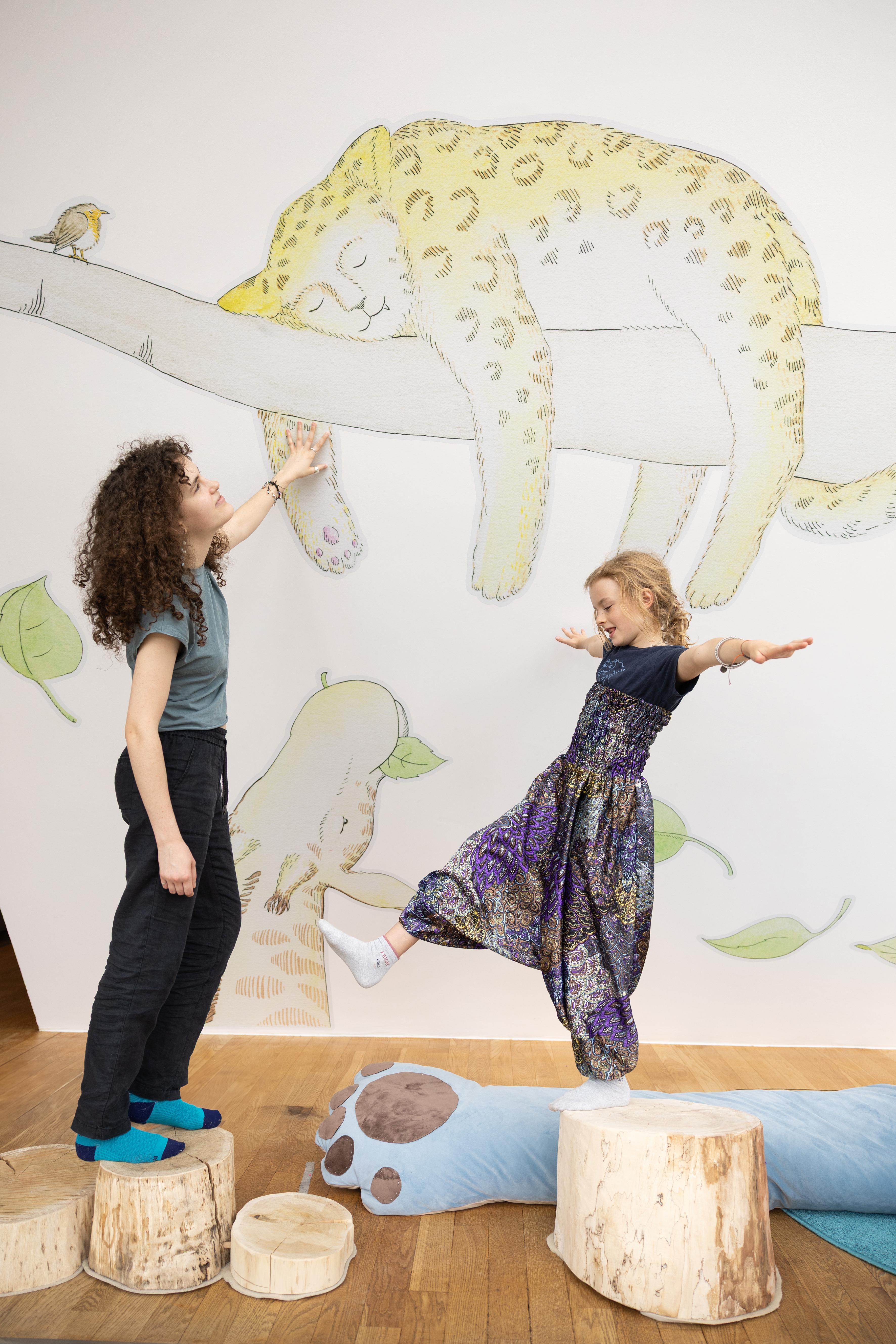 Julia Konieczna jest znana z ilustracji inspirowanych naturą, snami i opowieściami. Nawiązując do nazwy Muzeum Polin, oznaczającej „tu odpocznij” w języku hebrajskim, stworzyła interaktywną przestrzeń dla dzieci i dorosłych. Zwiedzający napotykają ogromnego pluszowego kota, który zachęca do przytulania, grę pamięciową w formie poduszki wieloryba, mural lasu w akwarelowej palecie barw oraz sensoryczne ilustracje pobudzające zmysły.
