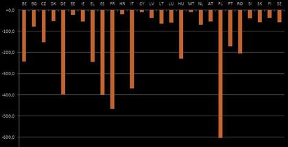 Przy założeniu, że w przypadku brexitu ubytek przychodów z brytyjskiej składki rozłożony zostanie pomiędzy otrzymujących fundusze europejskie w proporcji do wielkości otrzymywanych środków, Polska straci na wyjściu Wielkiej Brytanii około 600 mln euro rocznie, wynika z symulacji pb.pl. To oznaczałoby największy ubytek wśród wszystkich krajów unijnych. Blisko 500 mln euro straciłaby Francja, a Niemcy, Hiszpania i Włochy – po blisko 400 mln euro. Po co najmniej 200 mln euro straciłyby natomiast Belgia, Grecja, Węgry i Rumunia.