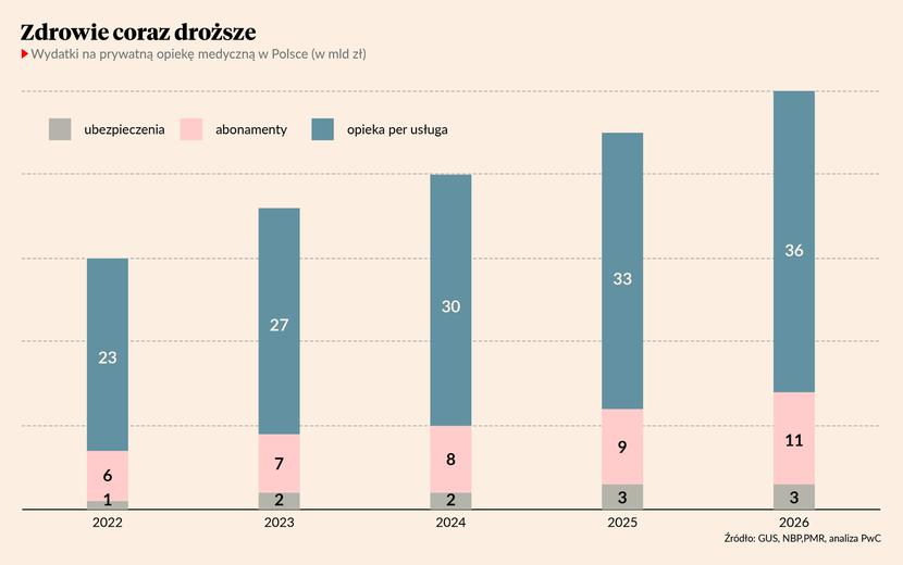 - Ekspansja prywatnych sieci przychodni doprowadziła do szybkiego wzrostu wydatków „pośrednich”, czyli głównie produktów firm abonamentowych i w mniejszym stopniu ubezpieczeń medycznych. Nawet jeżeli niewielka część społeczeństwa ma dostęp do abonamentów medycznych i prywatnych ubezpieczeń zdrowotnych, to pacjenci wydają ponad 20 mld złotych rocznie na prywatną opiekę opłacaną per usługa - mówi Arkadiusz Kramza, partner PwC Polska.