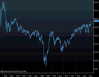 Wskaźnik cena/zysk dla spółek z indeksu S&P500 w ostatnich 15 latach. Źródło: Bloomberg.