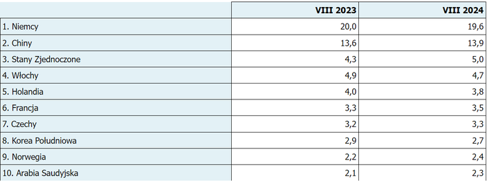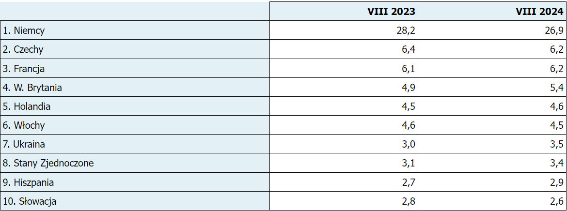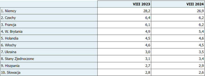 Udział Niemiec w polskim eksporcie po sierpniu 2024 roku wyniósł 26,9 proc., wobec 28,2 proc. po sierpniu 2023 roku - podał GUS.