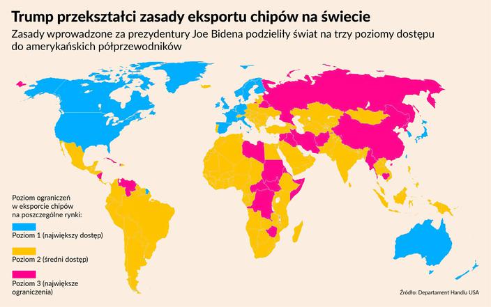 W ramach zasad wprowadzonych przez administrację Joe Bidena świat został podzielony na trzy grupy państw, różniące się poziomem dostępu do amerykańskich chipów AI. Na jednym końcu skali znalazły się kraje uprzywilejowane, jak USA, Japonia czy większość państw UE, na drugim – państwa całkowicie odcięte od zaawansowanej technologii, w tym Chiny, Rosja i Iran. Reszta świata została objęta pośrednimi ograniczeniami.