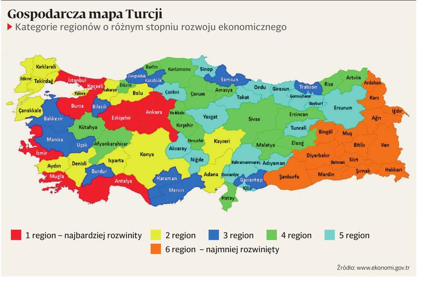Specjalne ulgi dostępne są dla inwestujących na terenach mniej rozwiniętych gospodarczo. Od stycznia 2012 r. Turcja wprowadziła nowy system wsparcia regionalnego uprawniający do korzystania z ulg w różnym zakresie. Celem jest przede wszystkim zachęcenie do działalności produkcyjnej na terenach mniej rozwiniętych ekonomicznie. Obszar Turcji został podzielony na sześć kategorii regionów o różnym stopniu rozwoju gospodarczego. Pierwsze trzy regiony reprezentują najbardziej rozwinięte obszary, natomiast pozostałe to rejony mniej lub najmniej rozwinięte pod względem ekonomicznym (mapka).