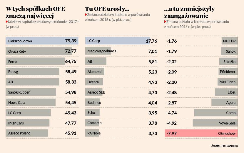 Poziom 30 mld zł przekracza także portfel Aviva OFE, czyli lidera z 2016 r. Najmniejszym giełdowym OFE niezmiennie pozostaje Pekao, które posiada akcje warte łącznie 2,21 mld zł. Miliardy te rozkładają się na akcje różnych spółek i w niektórych przypadkach dają funduszom możliwość wprowadzenia swoich osób do rady nadzorczej.