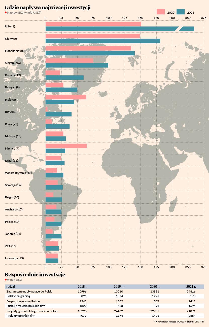 Ubiegły rok był bardzo dobry dla Polski pod względem bezpośrednich inwestycji zagranicznych (BIZ) – wynika z raportu UNCTAD, konferencji ONZ ds. handlu i rozwoju. Napływ BIZ skoczył o 79,4 proc. do 24,8 mld USD. Polska wskoczyła z 19 miejsca na świecie na 17 z takim samym poziomem inwestycji, co Australia i Japonia. Międzynarodowe fuzje i przejęcia były w Polsce w 2021 r. czterokrotnie wyższe niż rok wcześniej i sięgnęły 2,4 mld USD. Wartość projektów greenfield, czyli budowy zakładu od podstaw, nieznacznie spadła – o 3,9 proc. do niecałych 21,9 mld USD. Mocno w dół zjechały polskie inwestycje za granicą i to o prawie 90 proc., ale większą wartość miały zrealizowane przez polskie firmy transakcje M&A – niemal 1,7 mld USD wobec minus 91 mln USD rok wcześniej (co oznacza dezinwestycje), a także ogłoszone przez polskie firmy projekty greenfield.