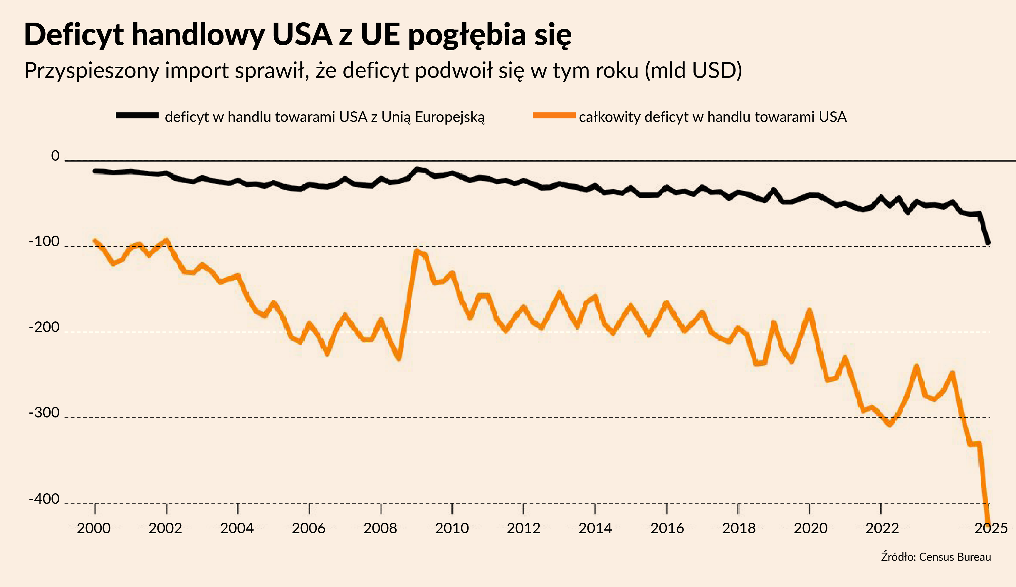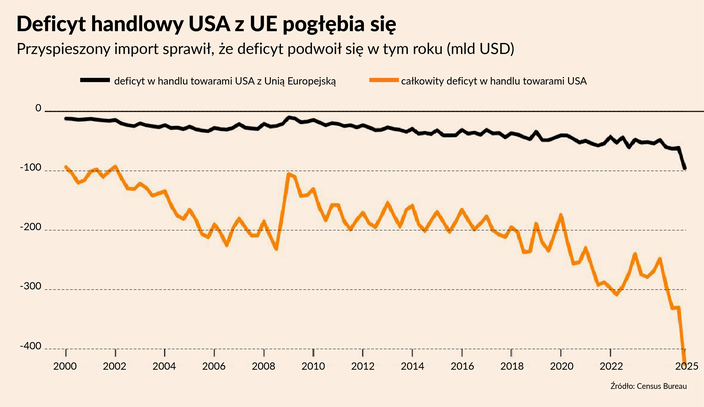 W tle tych napięć narasta deficyt handlowy USA z Unią Europejską. Jak pokazuje wykres agencji Bloomberg, w 2025 roku pogłębił się on dramatycznie – wskutek wzmożonego importu amerykański deficyt w handlu towarami z UE niemal się podwoił. To dodatkowy argument dla Donalda Trumpa, który traktuje nierównowagę handlową jako uzasadnienie ceł.