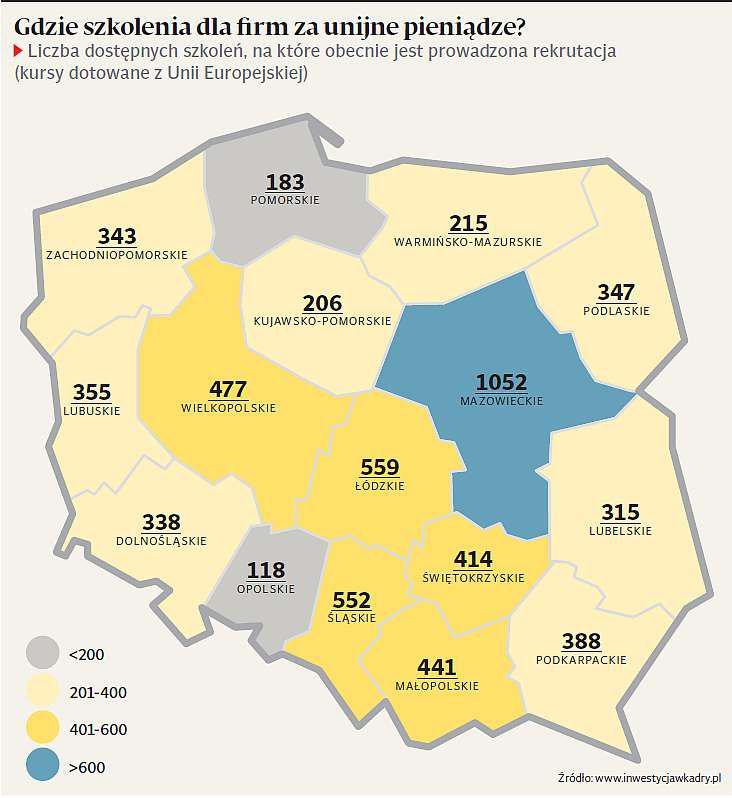 Przyszli pracodawcy mają też do dyspozycji poradnik „Vademecum szkoleniowe dla małych i średnich przedsiębiorstw”. Pod względem liczby dostępnych zajęć króluje Mazowsze, które jako jedyne ma w ofercie ponad tysiąc szkoleń. W ścisłej czołówce są też województwa łódzkie (559) i śląskie (552). Najmniejszy wybór mają przedsiębiorcy w kujawsko-pomorskim (206), pomorskim (183) i opolskim (118).