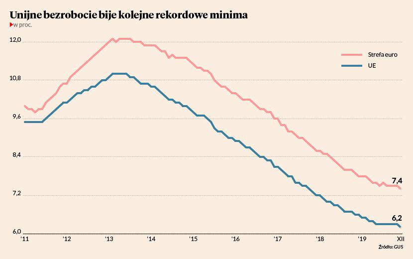 W obu przypadkach odnotowano spadek o 0,1 pkt proc. względem listopada. W przypadku danych dla całej UE to najniższy odczyt w historii comiesięcznych badań Eurostatu, które rozpoczęły się w styczniu 2000 r. W 21 państwach bezrobocie spadło, w sześciu wzrosło, natomiast w Danii pozostało bez zmian. Najniższe bezrobocie utrzymuje się w Czechach, gdzie stopa bezrobocia wynosi 2 proc., natomiast największy odsetek pozostających bez pracy znaleźć można w Grecji — aż 16,6 proc. aktywnych zawodowo. Bezrobocie wśród młodych spadło w ciągu minionego roku w UE o 0,5 pkt proc., z 14,6 proc. w grudniu 2018 do 14,1 proc. w grudniu 2019. W Polsce według metodologii Eurostatu bezrobocie wynosi 3,3 proc., natomiast wśród młodych 9,2 proc. szukających zatrudnienia pozostaje bez pracy.