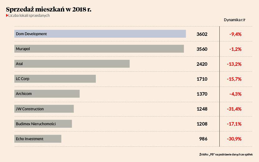 Żaden z dużych giełdowych deweloperów nie sprzedał w 2018 r. większej liczby mieszkań niż rok wcześniej. Niekiedy spadki sprzedaży były symboliczne — jak w przypadku Archicomu czy Murapolu, który na giełdzie ma notowane tylko obligacje, a do upublicznienia akcji dopiero się przygotowuje. W innych przypadkach erozja sprzedaży jest jednak bardzo wyraźna — np. w JW Construction Holding i Echo Investment wyniosła około 30 proc. W przypadku Echa przełożyło się to również na spadek sprzedaży poniżej symbolicznej granicy 1 tys. lokali.