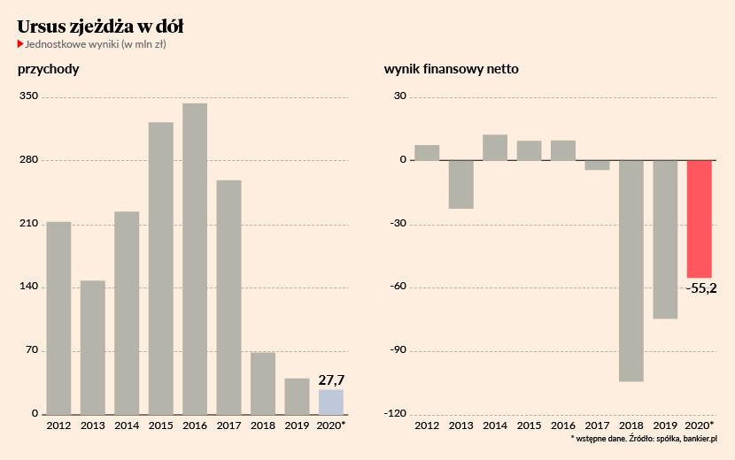 Kłopoty Ursusa nie zaczęły się oczywiście do komunikatu KNF z kwietnia 2019 r. Już dużo wcześniej spółka miała poważne problemy finansowe. Jej przychody kurczą się z roku na rok już od czterech lat. W każdym kolejnym roku w tym czasie Ursus miał ujemny wynik finansowy. Jego skumulowana strata netto w okresie 2017-20 przekroczyła 238 mln zł.