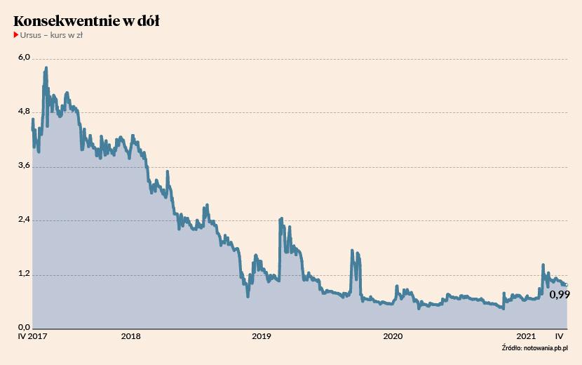 Najwyższy w historii kurs spółka odnotowała w połowie maja 2017 r. Było to 5,8 zł. Pod koniec października 2020 r. Ursus zanotował historyczne dno, czyli 0,45 zł za papier. W poniedziałek 26 kwietnia 2021 r. kurs spółki wynosił 0,98 zł, co oznaczało wzrost o 1 proc. w stosunku do piątkowego zamknięcia).