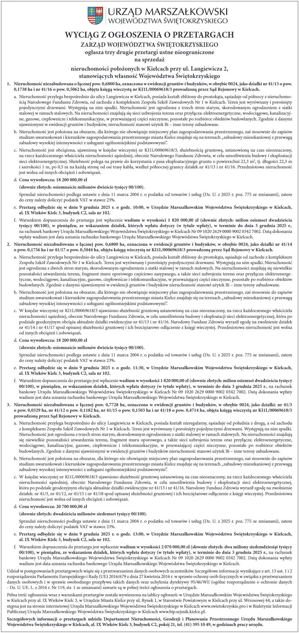 Urząd Marszałkowski Województwa Świętokrzyskiego ogłasza trzy drugie przetargi ustne nieograniczone na sprzedaż nieruchomości Komunikat partneraopublikowano: 2025-11-06 14:56.PosłuchajZostań subskrybentemi słuchaj tego oraz wielu innych artykułów w pb.pl o FOT.