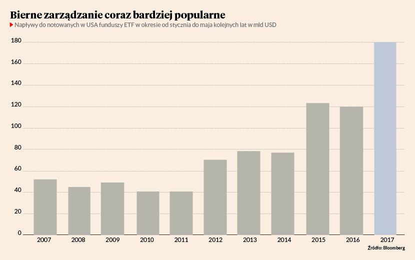 W okresie od stycznia do maja do notowanych w USA funduszy ETF napłynęło 180 mld USD. To o blisko połowę więcej niż w tym samym okresie ubiegłego roku oraz cztery i pół razy więcej niż w pierwszych pięciu miesiącach 2011 r. Wśród tych funduszy, które charakteryzują się biernym sposobem zarządzania oraz niższymi kosztami od funduszy aktywnie zarządzanych, najwięcej kapitału przyciągnęły te absolutnie najtańsze. Za połowę napływów odpowiadały te, których koszty nie przekraczały 0,1 proc. wartości aktywów rocznie.
