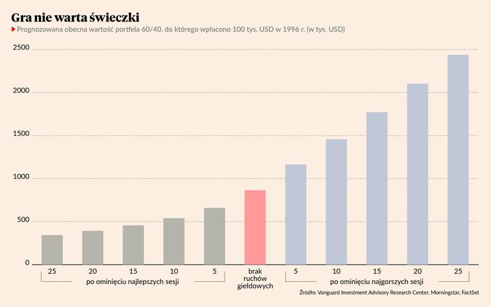 Francis M. Kinniry Jr., dyrektor centrum badań doradztwa finansowego w Vanguardzie, przekonuje, że nadaktywność inwestorów nie tyle nie przynosi korzyści, co może być bardzo bolesna. Dla przykładu, jeśli 28 lat temu inwestor wpłacił 100 tys. USD do klasycznego zdywersyfikowanego portfela 60/40 (60 proc. akcji i 40 proc. obligacji) i nic z nim nie robił, to dziś jego aktywa są warte około 865 tys. zł, zakładając brak podatków, opłat i dodatkowych wpłat. Gdyby jednak zdecydował się na aktywne zarządzanie i przez przypadek ominął pięć najlepszych sesji giełdowych w ciągu tych 28 lat, to jego portfel byłby dziś o ponad 200 tys. USD chudszy.