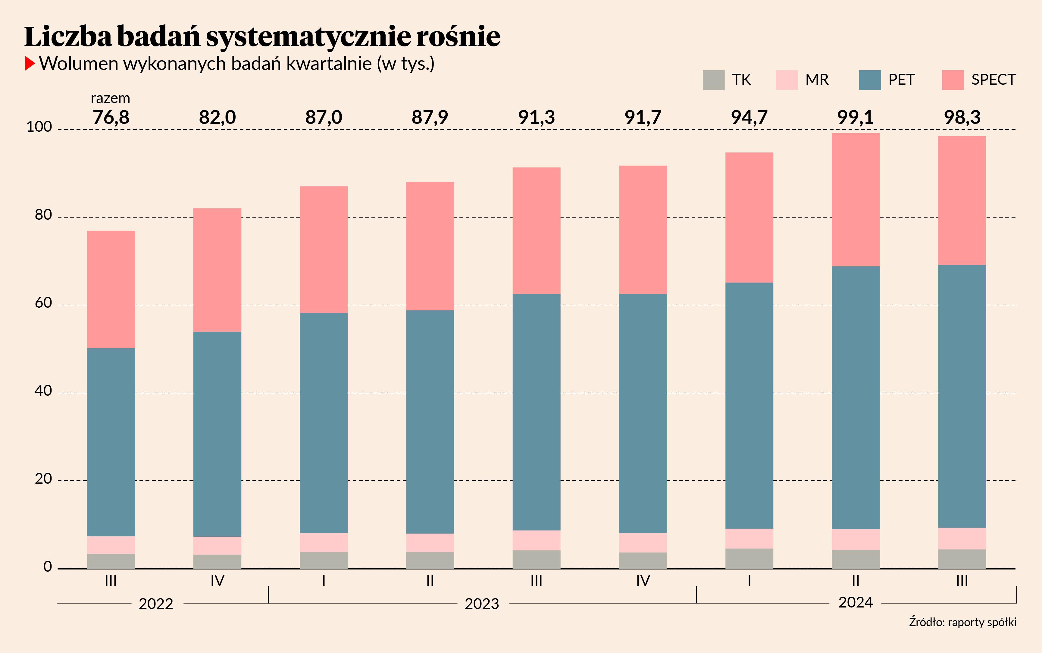 Według ostatnich danych Voxel wykonuje już prawie 100 tys. badań kwartalnie, a niższy wynik w III kwartale 2024 r. spółka tłumaczyła zamknięciem dwóch pracowni tomografii komputerowej. Mimo to i tak zdołano zwiększyć przychody z badań do 86,1 z 81,1 mln zł kwartał wcześniej. W skali roku liczbę badań udało się zwiększyć o 8 proc., a przychody z tego tytułu o 16 proc.