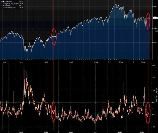 Notowania indeksu STOXX Europe 600 (górny wykres), na tle zmienności siostrzanego wskaźnika Euro STOXX 50 (dolny wykres, z zaznaczeniem średnich miesięcznych). Na obu wykresach zaznaczono moment, kiedy po okresie bessy zmienność zeszła na kilkunastomiesięczne minimum. Źródło: Bloomberg, pb.pl.