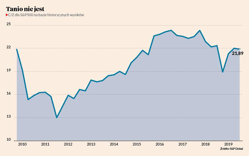 Pomimo wynikowej mizerii amerykańskie akcje wciąż wyceniane są bardzo wysoko. Nawet po ostatnich spadkach S&P500 znajduje się raptem 4,6 proc. poniżej ustanowionego pod koniec lipca szczytu wszech czasów. A to dlatego, że inwestorzy wciąż wierzą (a raczej chcą wierzyć), że rok 2020 przyniesie skokową poprawę zysków spółek. Analitycy już dali sobie spokój z prognozami zakładającymi wysoką dynamikę EPS-u w końcówce roku. Według najnowszych prognoz wyniki spółek w trwającym już IV kwartale mają urosnąć tylko o 1,3 proc. r/r. Ale za to rok 2020 ma przynieść istną wynikową bonanzę. Prognozy zebrane przez FactSet mówią o wzroście EPS-u o 7,8 proc. w pierwszym kwartale, o 9 proc. w drugim i o 10,6 proc. w całym 2020 r. Widać tu ewidentną rozbieżność między prognozami analityków giełdowych i obawami wyrażanymi przez ekonomistów, którzy dość powszechnie obawiają się recesji w przyszłym roku. Zresztą już od kilku miesięcy amerykańska gospodarka wysyła jednoznacznie recesyjne sygnały. Inwersja krzywej terminowej, załamanie koniunktury w przemyśle oraz pogorszenie kondycji rynku pracy — to tylko niektóre zwiastuny nadchodzącej dekoniunktury.