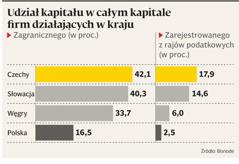 Polska gospodarka jest mało „kosmopolityczna”. Kapitały firm zarejestrowanych w naszym kraju tylko w 16,5 proc. pochodzą z zagranicy. Na Węgrzech, Słowacji i w Czechach udział zagranicznego kapitału jest około dwukrotnie wyższy. Co ciekawe, każde z czterech państw naszego regionu jest zdominowane przez biznes z innego państwa. W Polsce głównym inwestorem zagranicznym są Niemcy, w Czechach to Rosja, na Węgrzech — Ukraina, a na Słowacji — Węgry. Dane Bisnode pokazują też, że polskie firmy relatywnie rzadko korzystają z usług rajów podatkowych. Zarejestrowane jest tam tylko 2,5 proc. kapitału firm działających w Polsce. W Czechach to aż 17,9 proc.