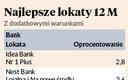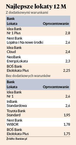 Zgoda na spełnienie dodatkowych warunków na lokacie rocznej poszerza paletę banków, ale nie zwiększa istotnie oprocentowania — na lokacie Nr 1 Plus w Idea Banku odsetki w skali roku to 2,8 proc., a dodatkowe 0,2 pkt. proc. to nagroda za posiadanie konta osobistego w banku. Nest Bank ma w ofercie dwa depozyty ze stawką 2,4 proc., które naliczy posiadaczom konta w banku, którzy na dodatek w każdym miesiącu trwania lokaty zapewnią wpływ wynagrodzenia w wysokości 2,5 tys. zł (lub 6 tys. zł w przypadku posiadania konta firmowego) albo przyniosą do banku tzw. nowe środki. W NeoBanku na energoLOKACIE 12M stawka w wysokości 2,3 proc. dostępna jest dla nowych klientów, którzy założą konto osobiste lub portfel depozytowy. Nieco mniej, bo 2,25 proc., proponuje BOŚ Bank na Ekolokacie Plus, który oprócz standardowego wymogu, czyli posiadania konta osobistego, chce też, by klient był aktywny — co miesiąc dokonywał transakcji bezgotówkowych kartą na kwotę minimum 300 zł i na rachunku osobistym utrzymywał co najmniej 10 proc. wartości lokaty. © Ⓟ