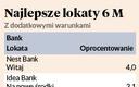Oferta lokat na pół roku jest skromniejsza niż na jeden kwartał. Stawkę 4 proc. proponuje tylko Nest Bank, który na dodatek dość nisko ustawia limit kwoty depozytu (10 tys. zł) i wymaga spełnienia kilku dodatkowych warunków. Trzeba założyć konto osobiste (i to wskazane przez bank — chodzi o Nest Konto), a następnie maksymalnie w ciągu 30 dni złożyć wniosek o lokatę. Na konto osobiste trzeba też przelewać co miesiąc wynagrodzenie w wysokości nie mniejszej niż 2,5 tys. zł, a jeśli prowadzimy działalność gospodarczą, to wpływy muszą być nie mniejsze niż 6 tys. zł (trzeba też opłacać z konta zaliczki podatku dochodowego lub składki na ZUS). Za plecami Nest Banku, ale niezbyt blisko, są Idea Bank i Lion’s Bank, oferujące 3,1 proc. na lokatach Na nowe środki i Desire (także w wariantach z Plusem). Przez „nowe środki” Idea Bank rozumie nadwyżkę ponad łączne saldo na posiadanych przez klienta rachunkach osobistych, oszczędnościowych, lokatach lub strukturach w banku lub jego oddziale Lion’s na koniec 20. dnia poprzedzającego miesiąc, w którym otwierana jest lokata Na nowe środki.