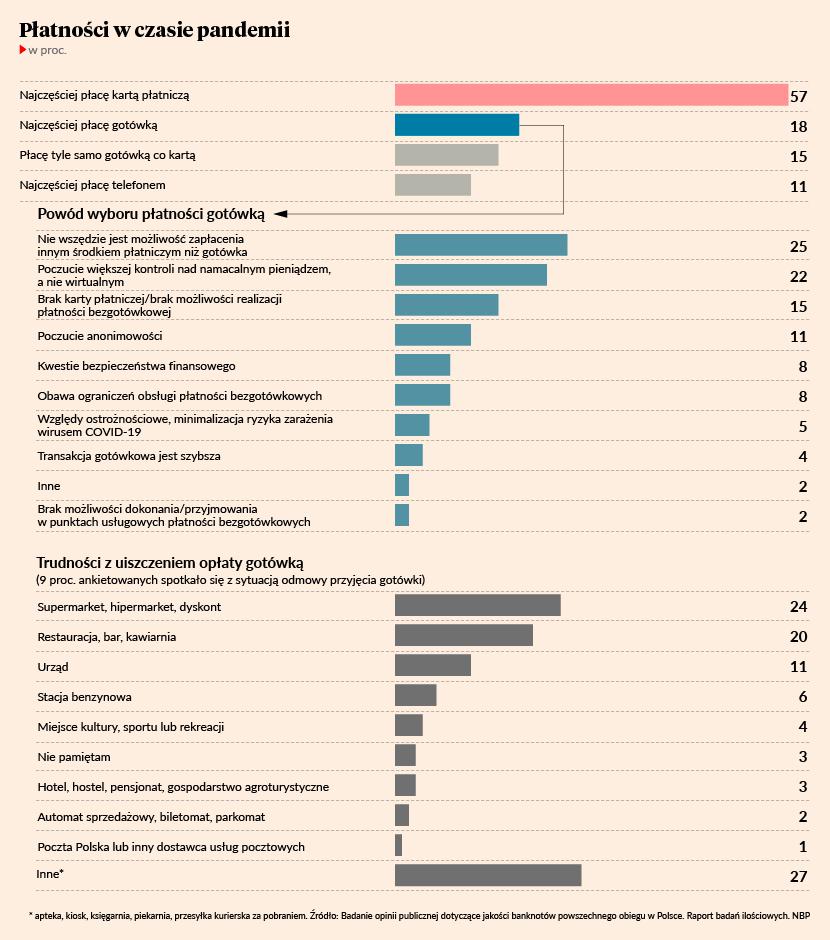 Badania NBP wskazują jednak, że problem z płatnościami gotówką w Polsce występuje. We wrześniu i październiku 2020 r. bank centralny zapytał Polaków, jak płacą w czasie pandemii. Aż 68 proc. ankietowanych najczęściej używało karty lub telefonu, a 15 proc. posługiwało się gotówką. Aż 9 proc. powiedziało, że spotkało się z odmową przyjęcia płatności gotówkowej, głównie w aptece, piekarni, u kuriera, ale też w supermarketach i dyskontach.