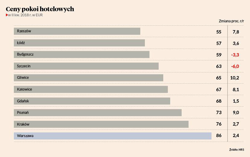 W większości polskich miast ceny poszły w górę, w większości europejskich utrzymały się na stabilnym poziomie. Najwyższe są w Kopenhadze, Londynie, Amsterdamie i Zurychu. Ogromny wzrost, o 38 proc. — do 131 EUR, zanotowała Moskwa, w której 14 czerwca odbył się mecz otwarcia piłkarskiego mundialu. W Oslo hotelowe ceny potaniały o 32 proc.— do 147 EUR, prawdopodobnie dlatego, że organizowana raz na dwa lata wystawa morska „Nor Shipping”, która przyciąga 16 tys. zwiedzających, nie odbywa się w tym roku.