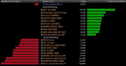 Stopy zwrotu z głównych wskaźników giełd światowych. Źródło: Bloomberg.