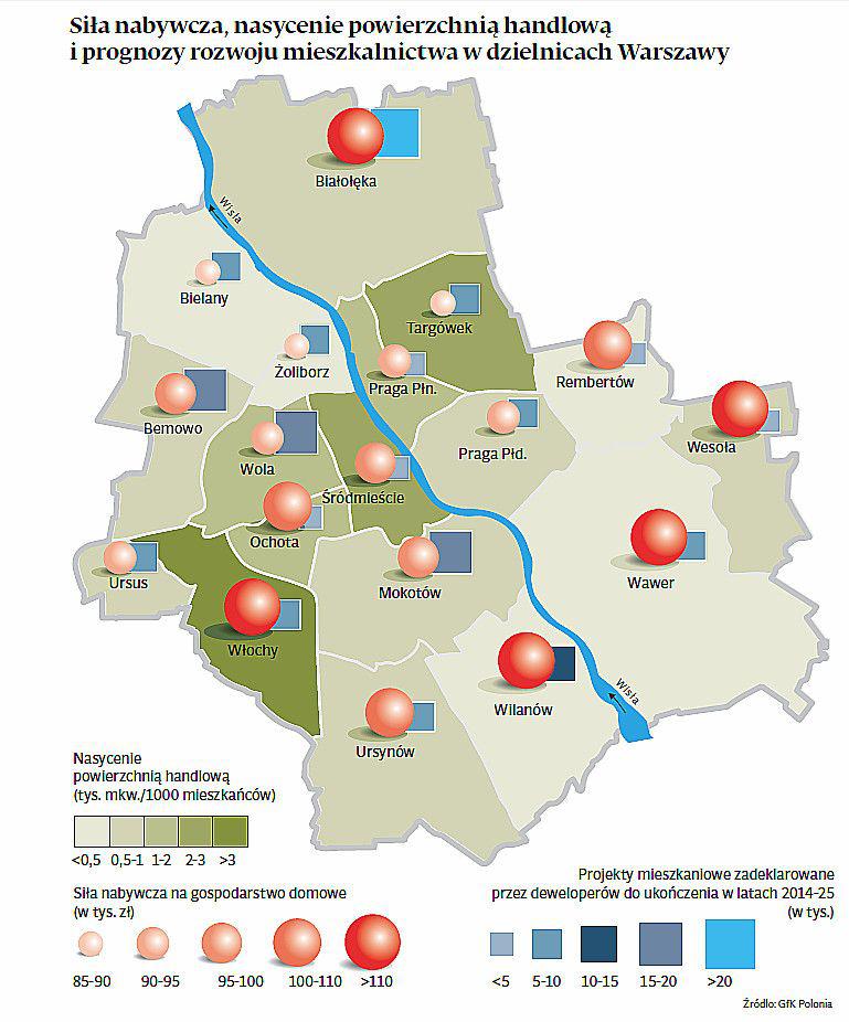 Mimo relatywnie wysokiego wskaźnika nasycenia powierzchnią handlową (1,15 tys. mkw. na 1 tys. mieszkańców) stolica może się też pochwalić najwyższą siłą nabywczą (blisko 100 tys. zł rocznie na gospodarstwo domowe, średnio około 30 proc. więcej niż średnia w kraju). Dodatkowo, według Reas, do 2025 r. Warszawie przybędzie około 170 tys. domów i mieszkań — co oznacza napływ ludności, szczególnie młodych i pracujących. Obecnie aglomeracja warszawska dysponuje 1,6 mln mkw. powierzchni handlowej. To 13 proc. polskiego rynku. W kwietniu warszawski ratusz otrzymał analizę firmy Aecom, wskazującą na to, że stolica może jeszcze pomieścić 17 centrów handlowych.