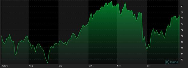 Notowania cen ropy Brent, 6M, źródło: baha.com
