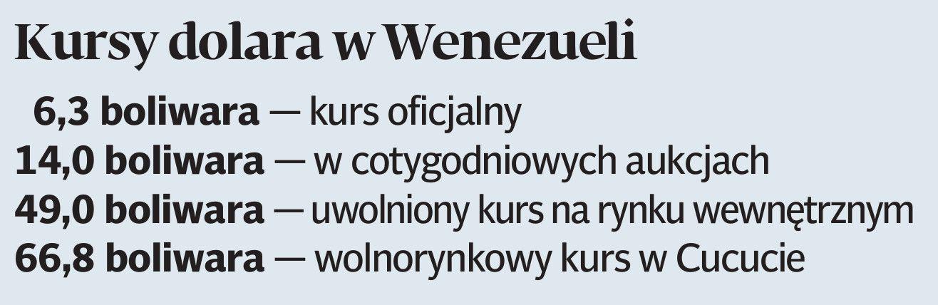 — Nie znam żadnego kraju na świecie, który miałby bardziej niewydolny i absurdalny system walutowy niż Wenezuela. Prowadzi on do niekontrolowanej inflacji, wahań dochodów budżetowych i znaczących dewaluacji waluty — komentował Ricardo Hausman, badacz Uniwersytetu Harvard, a w latach 1992-93 minister planowania Wenezueli. Absurd doszedł do tego stopnia, że Wenezuelczycy najłatwiej mogli zaopatrzyć się w dolary w nadgranicznej kolumbijskiej miejscowości Cucuta, 560-tysięcznym mieście, gdzie blisko 200 lat temu Simon Bolivar założył kongres, mający zjednoczyć ziemie wyzwolone spod hiszpańskiego panowania. W ciągu czterech lat, od kiedy Hugo Chavez zakazał handlu walutami, Cucuta stała się największym na świecie centrum handlu walutą Wenezueli, nazwaną boliwarem właśnie po libertadorze. Wartość transakcji boliwarem zawieranych w kantorach w Cucucie zbliża się do 1 mln USD dziennie. Mimo to zmiany w wenezuelskim systemie walutowym wciąż trudno nazwać rewolucją. Do obowiązujących dotychczas dwóch kursów wymiany zostanie dodany trzeci. Będzie on używany właśnie w transakcjach, jakie na wolnym rynku brokerzy zawierać będą z klientami. W zamierzeniu władz ma on zamknąć lukę pomiędzy kursami oficjalnymi, po których nabycie waluty nieraz graniczy z cudem, a kursem czarnorynkowym. Ten ostatni wycenia obecnie dolara nawet na 11 razy więcej niż oficjalny kurs, używany do rozliczania zakupów priorytetowych towarów.
