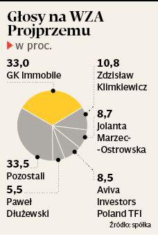 GKI systematycznie zwiększa zaangażowanie w Projprzemie. Jeszcze wiosną 2016 r. miała 22,2 proc. akcji uprawniających do 17,5 proc. głosów. Do 25,8 proc. głosów wzrósł stan posiadania GKI w wyniku wezwania z kwietnia 2016 r. Immobile oferowało wtedy 8,50 zł za akcję. Zarząd Projprzemu uznał, że cena ta znacznie odbiega od wartości godziwej i jest wyraźnie niższa od wartości księgowej, która na koniec 2015 r. wynosiła 15,08 zł na akcję, a w ujęciu skonsolidowanym 15,64 zł.