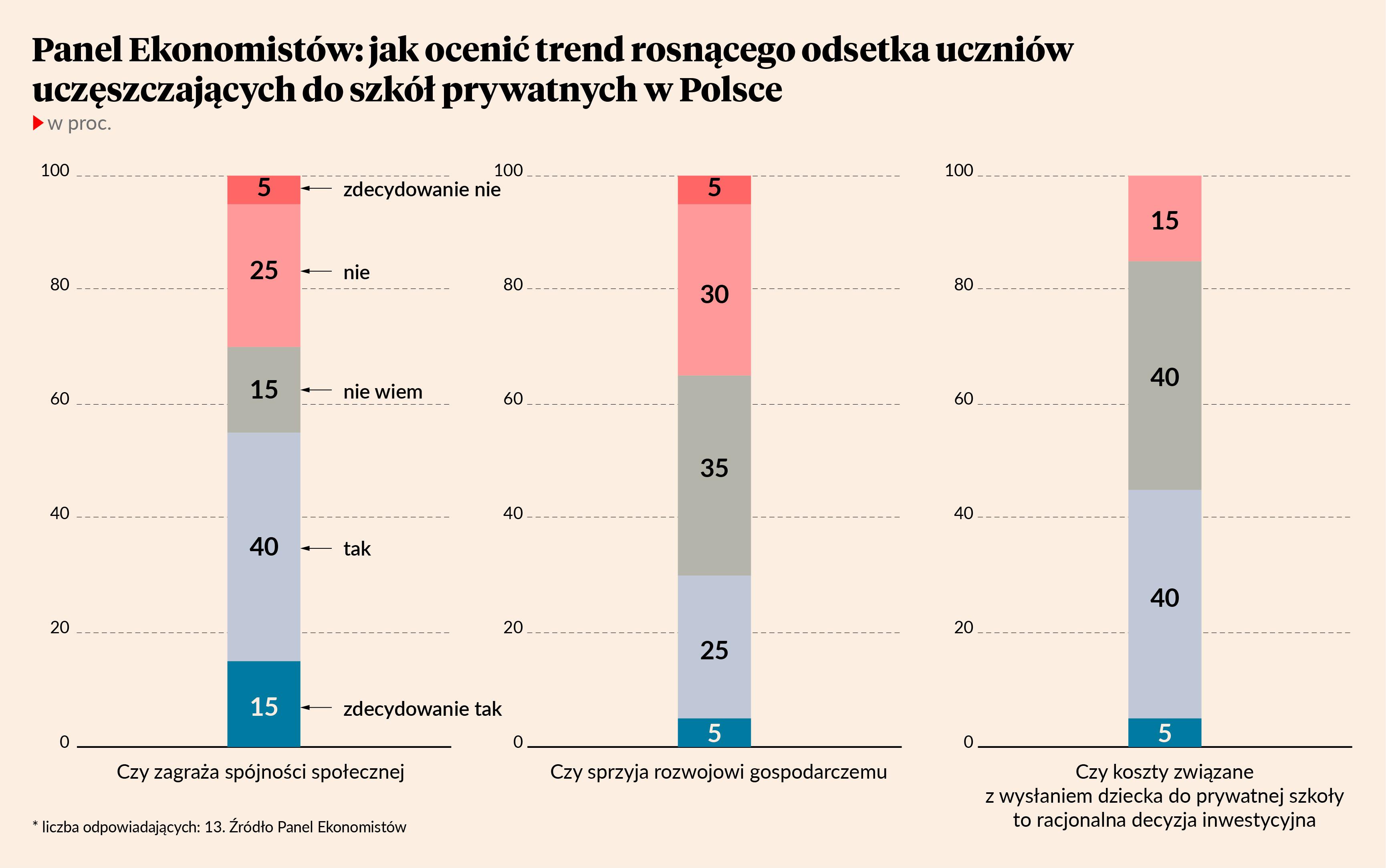 Comiesięczne badanie opinii naukowców i analityków pracujących w instytucjach naukowych, badawczych i prywatnych firmach pokazuje rozkład opinii w sprawach ważnych z punktu widzenia polityki publicznej. Ponad połowa ankietowanych ekonomistów twierdząco odpowiedziała na pytanie, czy rosnący odsetek uczniów chodzących do prywatnych szkół zagraża spójności społecznej. Co ciekawe, twierdzącej odpowiedzi udzielali eksperci o różnych inklinacjach ideowych – tych bardziej socjalnych, ale też liberalnych.