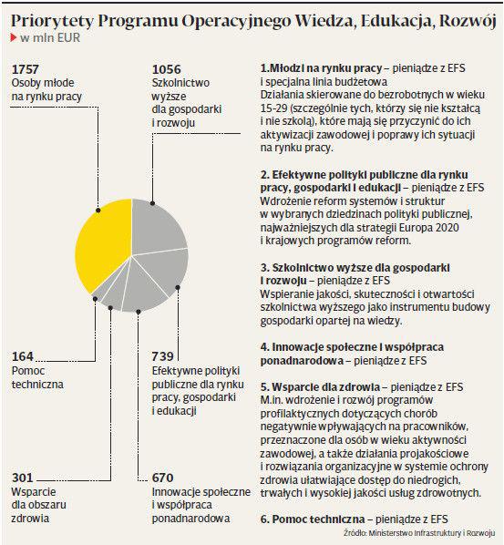W latach 2007-13 pieniądze z Europejskiego Funduszu Społecznego (EFS) były rozprowadzane poprzez Program Operacyjny Kapitał Ludzki (POKL). Obowiązywała zasada: jeden fundusz (EFS) — jeden program (POKL). W latach 2014-20 będzie inaczej. Większością pieniędzy z EFS (około 66 proc.) będą zarządzały samorządy w ramach Regionalnych Programów Operacyjnych (RPO). Sfinansują dzięki tym pieniądzom przedsięwzięcia podejmowane z myślą o konkretnych osobach i grupach. Każde województwo w ramach RPO stworzy własny plan na wykorzystanie środków z EFS. Natomiast ponad 4,4 mld euro zagospodaruje nowy, zatwierdzony przez UE 17 grudnia 2014 r. Program Operacyjny Wiedza, Edukacja, Rozwój (PO WER).