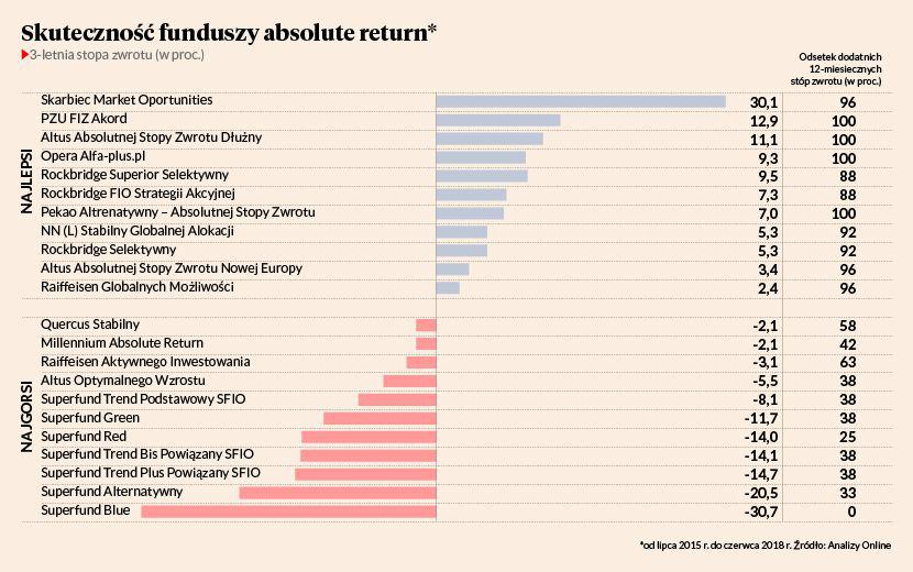 Exodusowi klientów nie ma się co dziwić. Mimo różnic w szczegółach strategii inwestycyjnych, marketingowy przekaz TFI o zarabianiu w każdych warunkach rynkowych nie wytrzymał zderzenia z rzeczywistością. Z opracowań Analiz Online wynika, że na rynku istnieje 31 funduszy absolutnej stopy zwrotu dostępnych dla każdego — otwartych lub zamkniętych, ale sprzedawanych w ofertach publicznych — mających co najmniej trzyletnią historię. Ich średnia stopa zwrotu za ten trzyletni okres to 0,5 proc. Aż 14 było przy tym na minusie, z czego sześć o kilkanaście lub więcej procent. Kilkunastoprocentowy lub większy zysk odnotowały cztery fundusze. Oznacza to, że większość funduszy absolute return — nawet tych będących na plusie — osiąga wynik gorsze niż zupełnie przeciętne fundusze dłużne.