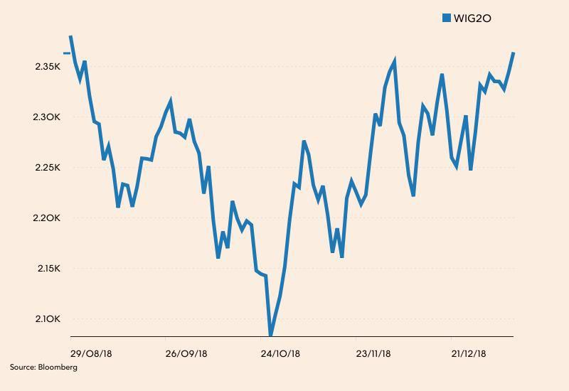 Na środowym zamknięciu WIG20 zyskał 0,84 proc. i wyniósł 2.364,2 pkt., co jest najwyższym poziomem zamknięcia od 29 sierpnia 2018 roku.
