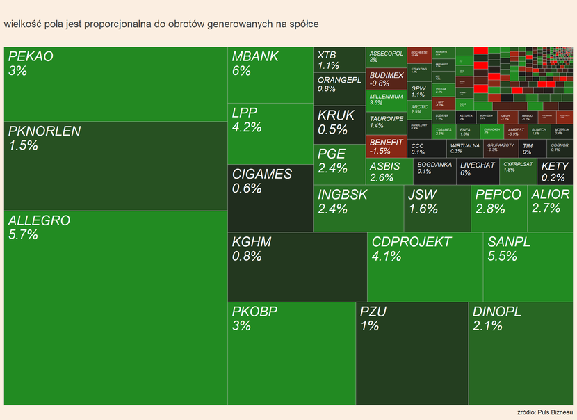 Gwiazdą sesji było Allegro, którego akcje wspinają się do dawno nie widzianych poziomów. Do pary z walorami platformy drożały też akcje CD Projektu.