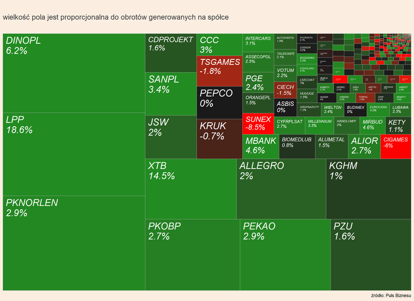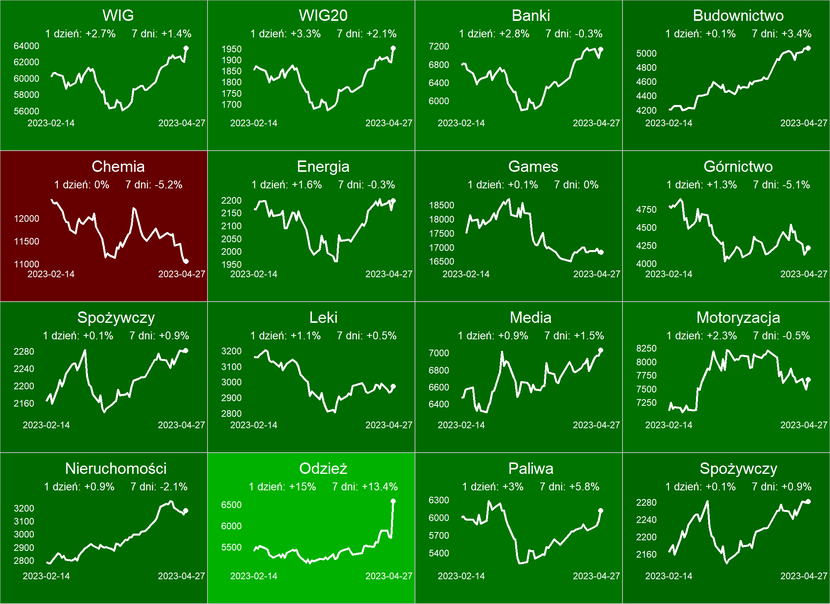 Spora w tym zasługa zwyżki notowań spółek nastawionych na konsumenta: Dino Polska wspięło się na historyczny szczyt po wzroście o ponad 5 proc., akcje LPP podrożały o 17 proc. Druga ze spółek pochwaliła się wynikami i nakreśliła niezłe perspektywy na kolejne kwartały, co pomaga także innym spółkom modowym. W zwyżce WIG20 nie przeszkadza największy składnik indeksu - PKN Orlen (potwierdził, że dywidenda za 2022 r. ma wynieść 5,5 zł), a swoją cegiełkę dodaje większość spółek, w tym banki.