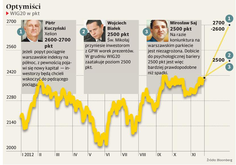 Specjalista podkreśla, że w sytuacji gdy na horyzoncie nie widać wielkich zagrożeń, można się spodziewać tzw. strojenia okien przez fundusze — zarządzającym zależy na tym, aby na koniec roku „podkręcić” stopy zwrotu osiągane na rynku akcji. Według Piotra Kuczyńskiego, pęknięcie na WIG20 oporu 2450 pkt otworzy drogę do ataku na 2600-2700 pkt. Jest jeden warunek — zwyżka musi być poparta zwiększeniem obrotów. Jeżeli popyt pociągniewarszawskie indeksy na północ, z pewnością pojawi się nowy kapitał — inwestorzy będą chcieli wskoczyć do pędzącego pociągu. Optymistą jest także Wojciech Białek, główny analityk CDM Pekao.