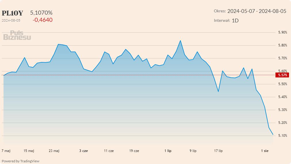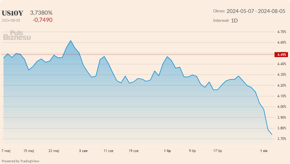 Warto zwrócić uwagę, że wyprzedaż nie jest powszechna tak, jak bywało np. w czasie pandemicznego krachu. W cenie od kilku tygodni są obligacje, ponieważ inwestorzy liczą na bardziej zdecydowane obniżki stóp procentowych. Spekuluje się nawet o interwencyjnej obniżce stóp przez Fed, by uspokoić rynki, rosną też szanse na obniżkę o 50 pkt baz. na posiedzeniu zaplanowanym na wrzesień.