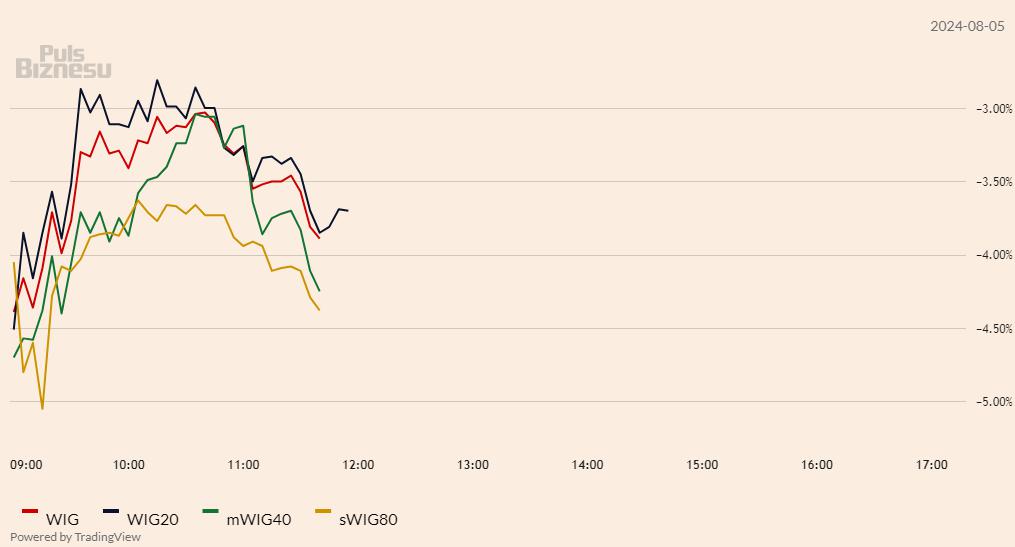 WIG20 zaczął sesję od spadku o 3,4 proc. do 2261 pkt. Jeszcze więcej, bo ponad 4 proc., straciły indeksy małych i średnich spółek. Próba odbicia spełzła na niczym i indeksy jeszcze przed południem skierowały się w stronę sesyjnego minimum.