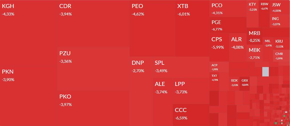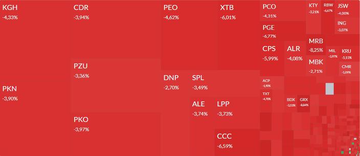 Na czerwono notowana jest ponad 90 proc. akcji z rynku głównego, a w szczególności dotyczy to popularnych w ostatnim czasie akcji Mirbudu, XTB, Cyfrowego Polsatu, Rainbow Tours czy CCC. Próżno zresztą szukać zielonych wysp, bo jeśli są, to raczej wśród niepłynnych walorów.