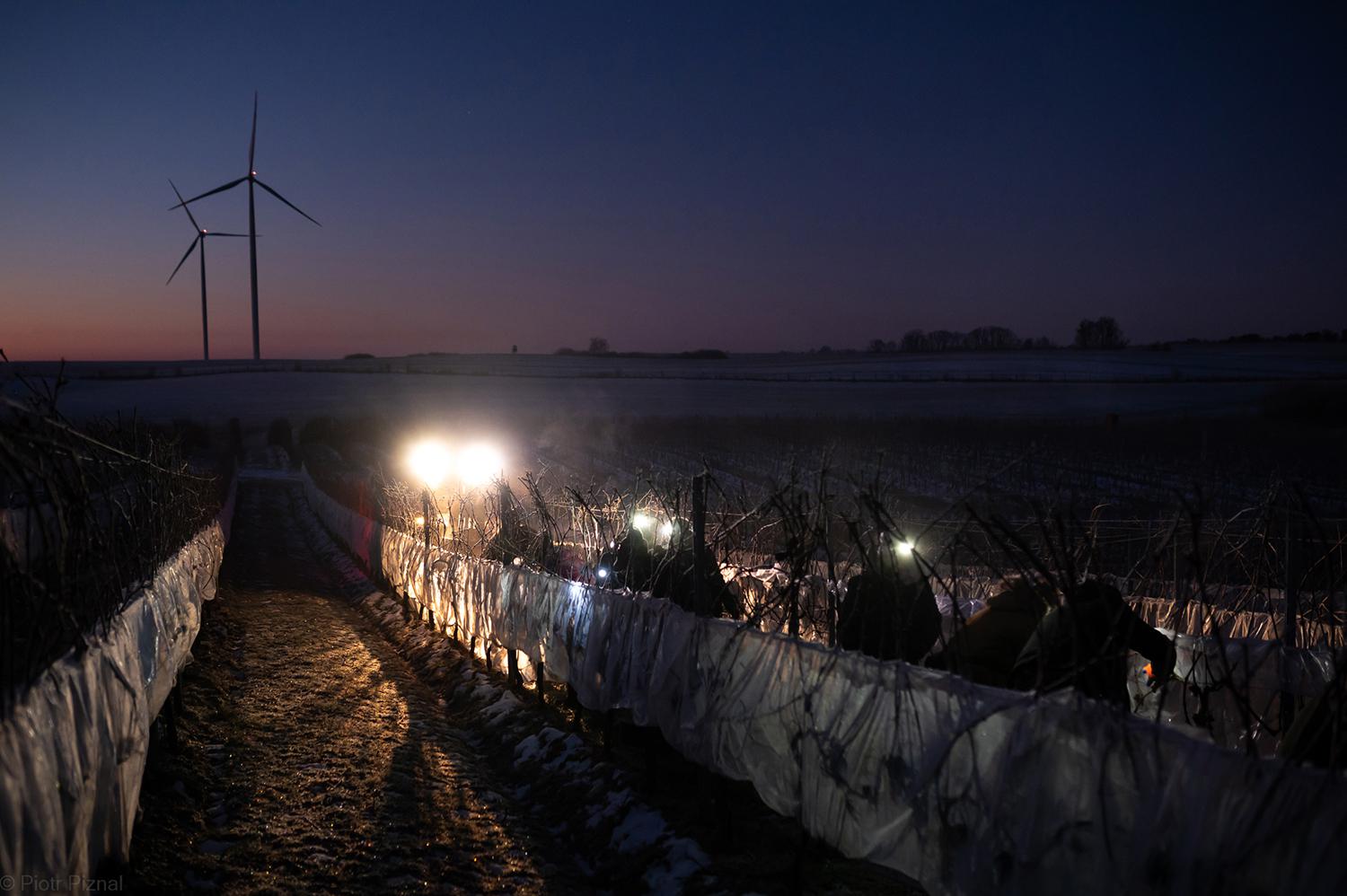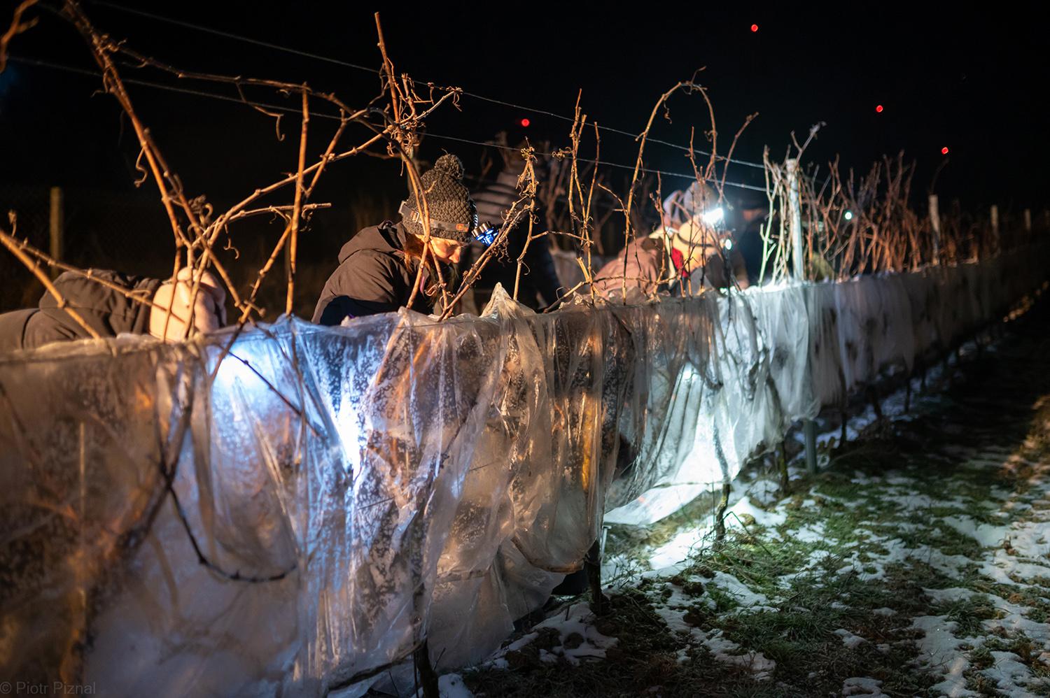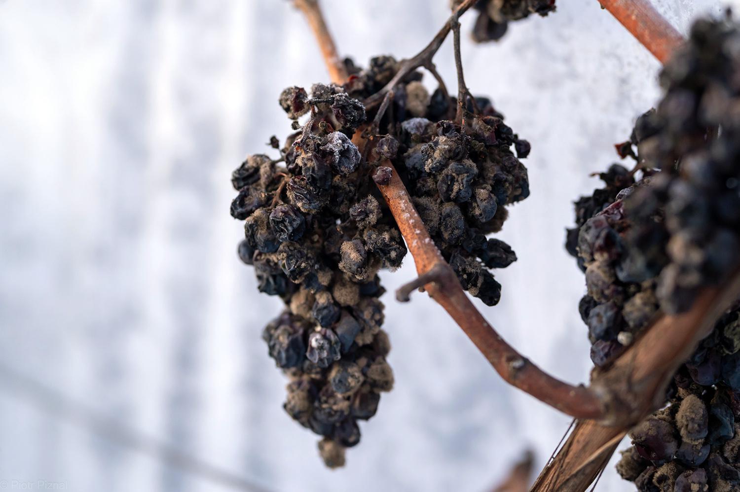 – Część gron zostawiamy na zbiory zimą. Czekamy, kiedy temperatura odpowiednio spadnie, a winogrona zamarzną i staną się twarde. Wówczas zbieramy je pod osłoną nocy i zawozimy do winiarni. Z każdego grona wyciskamy niewielką ilość słodkiego i esencjonalnego soku. Tłoczenie zamarzniętych owoców w prasie odbywa się w dzień i także wtedy powinna panować ujemna temperatura – wyjaśnia Jacek Turnau, współwłaściciel Winnicy Turnau.