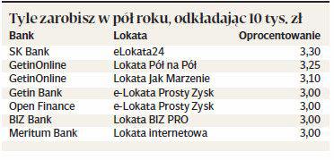 Korzystnie, w przypadku depozytu wysokości 10 tys. zł wypadają produkty Getin Banku, a szczególnie jego internetowego segmentu GetinOnline. Porównując te lokaty, należy jednak zwrócić uwagę, że najbardziej atrakcyjna z nich to w rzeczywistości bardziej złożony produkt. Na lokacie Pół na Pół pieniądze są dzielone po równo na dwie jednakowo oprocentowane lokaty — kwartalną i półroczną. Poza tym pakietem GetinOnline oferuje również Lokatę Jak Marzenie, na której na 3,1 proc. ulokować można od 1 tys. zł do nawet 1 mln zł. Automatycznie lokata zakładana jest jako odnawialna, po upływie umownego okresu odnawiana jest jednak na oprocentowaniu równym stopie referencyjnej NBP, związana z marzeniami nazwa staje się więc wtedy nieco mniej stosowna.