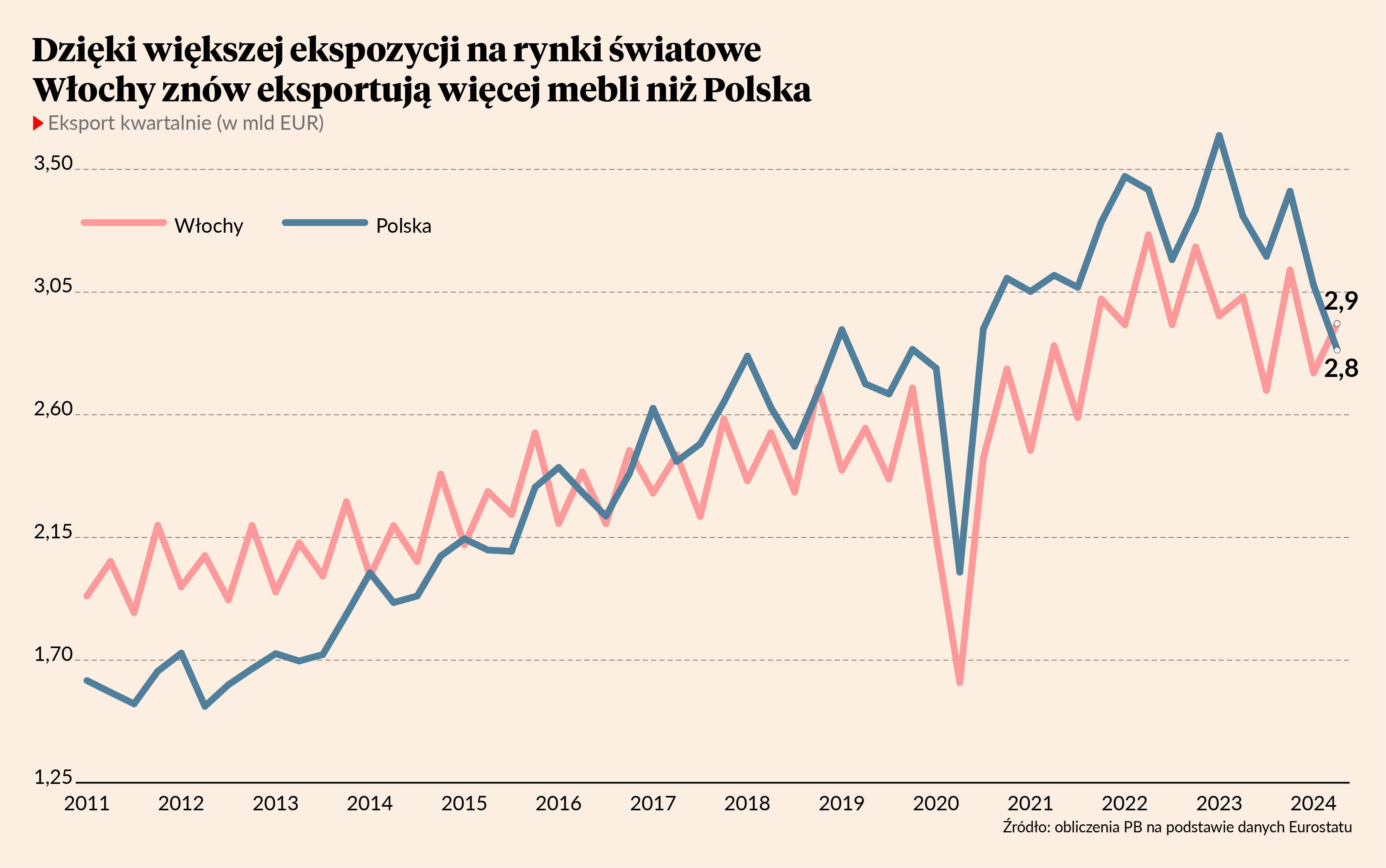 Na początku XXI wieku udział Włoch w całkowitym imporcie mebli do UE wynosił blisko 30 proc. Potem jednak do Unii weszły kraje Europy Środkowo-Wschodniej (czyli pojawiła się nowa konkurencja), następnie wybuchł kryzys finansowy, aż wreszcie Włochy stanęły na skraju potężnego kryzysu fiskalnego i gospodarczego. Złote czasy się skończyły. A schedę w eksporcie mebli stopniowo zaczęła przejmować Polska.
