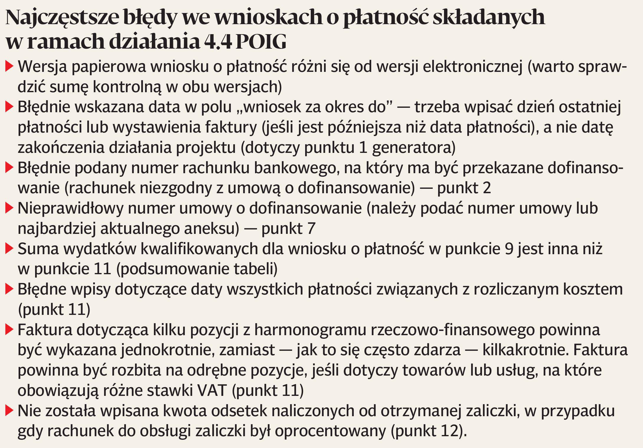 — I tak w przypadku popularnego wśród małych i średnich przedsiębiorców działania 4.4 jest wymagane, aby podczas realizacji projektu beneficjent wystąpił o wypłatę środków dofinansowania co najmniej dwukrotnie. Musi też rozliczyć wydatki do 31 października określonego roku kalendarzowego — podkreśla Łukasz Kościjańczuk, konsultant z firmy doradczej Crido Taxand.