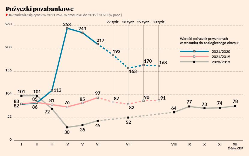 O tym, że rynek odbija po pandemicznej stagnacji świadczą dane Biura Informacji Kredytowej. Łączna sprzedaż firm pożyczkowych, które raportują do BIK (nie cały rynek to robi, ale najwięksi tak), wyniosła w czerwcu tego roku 661 mln zł. To o 119,9 proc. więcej niż rok wcześniej. Branża udzieliła w czerwcu 261,9 tys. pożyczek (wzrost r/r o 88,6 proc.). Średnia wartość udzielonego finansowania wynosiła 2,2 tys. zł i była o 11,5 proc. wyższa niż przed rokiem. Przed pandemią firmy pożyczały rocznie ponad 6 mld zł, a liczba klientów ogółem (czyli wszystkich korzystających z pozabankowych pożyczek) sięgała 3 mln, a aktywnych (czyli z czynną pożyczką) było ponad 600 tys.
